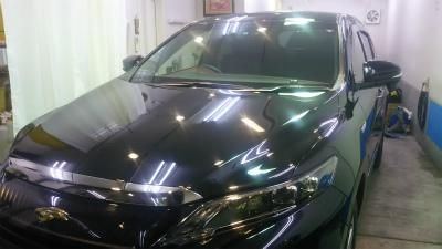 そのようなボディ塗装面に有りました、不純物をできる限りクリーナー等にて除去洗浄いたしまして、この車のような黒のソリッドカラーの濃色車には最も相応しいGT−Cグラステックボディコーティングを施工いたしまして、更に映り込みも良いまるで漆塗りの器のようなしっとりとした重厚感溢れます艶を感じさせます仕上がり出来上がりになりました。